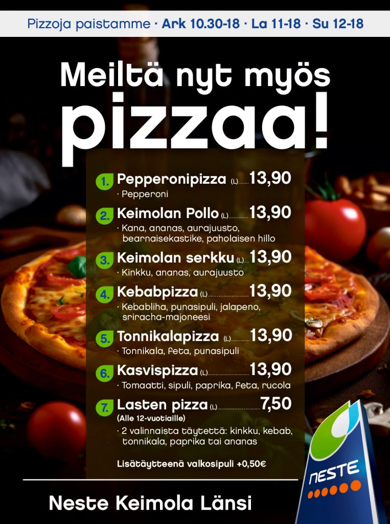 Nyt meiltä saatavilla myös Pizzaa. Valmistamme Pizzat itse tuoreista raaka-aineista.